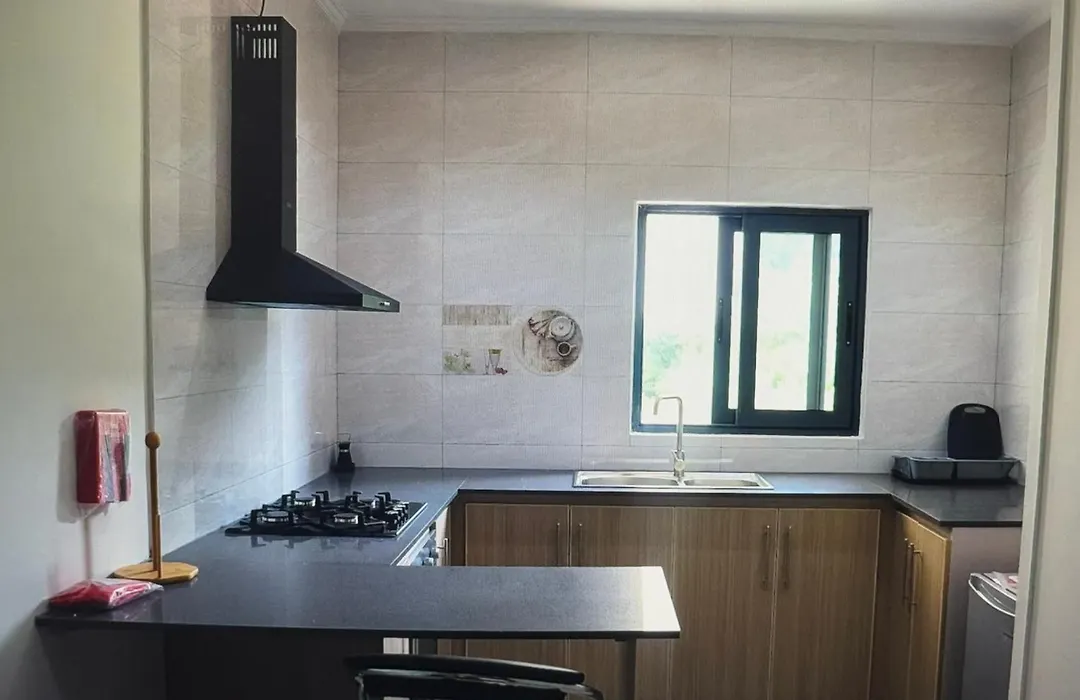 Este apartamento está amueblado con una cocina completa para la comodidad de los huéspedes.